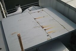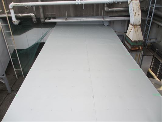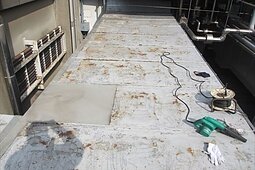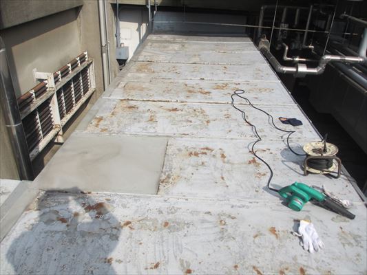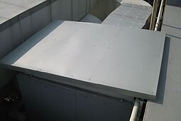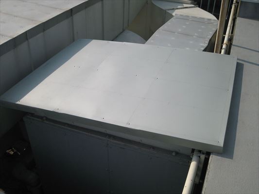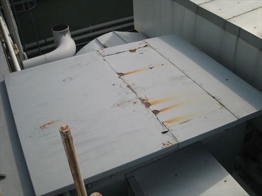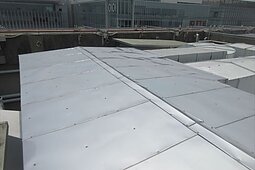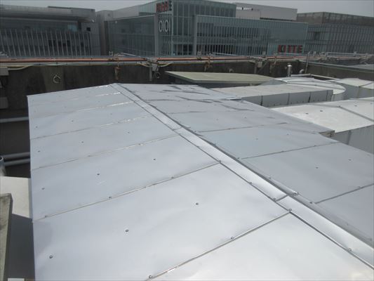 ダクト工事(修繕) Before After 工事内容 ダクト修繕 エリア 博多 場所 オフィスビル 屋上設置のダクト設備は永年雨風にさらされるため、継ぎ目部分が劣化し雨漏れの原因となっていました。本工事は、空調の給排気集合ダクトのため、巾2.5m×高さ2.3m×全長100mとなっていました。その全てに防水を行った上で、野地板で囲いガルバリウム鋼板にて覆い被せ、目地止めを行い完了。